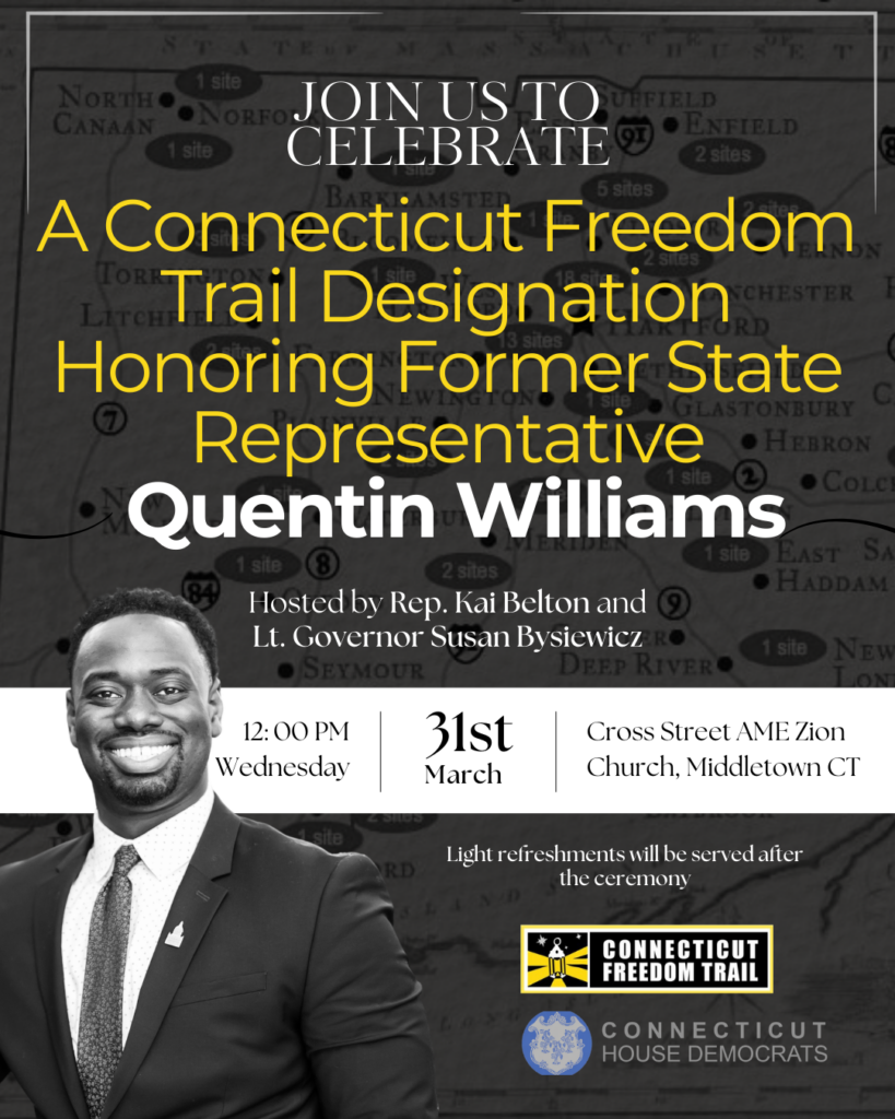 Home Events at Freedom Trail Sites Celebration of Rep. Williams Designation to the CT Freedom Trail – Tuesday, March 31, 2026 – 12pm Date March 31, 2026 Time 12:00 pm - 1:00 pm